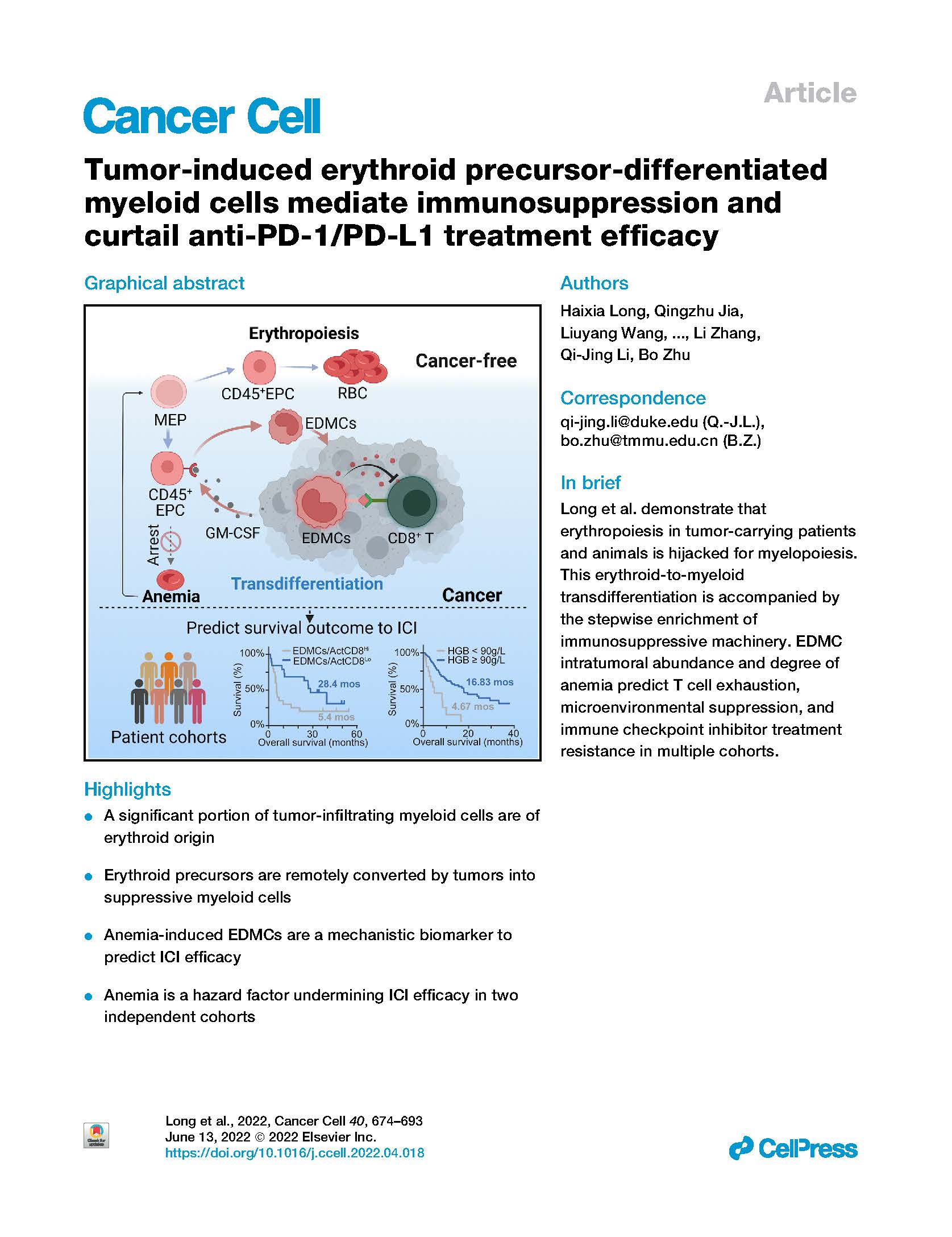 Tumor-induced erythroid precursor-differentiated myeloid cells mediate immunosuppression and curtail anti-PD-1/PD-L1 treatment efficacy